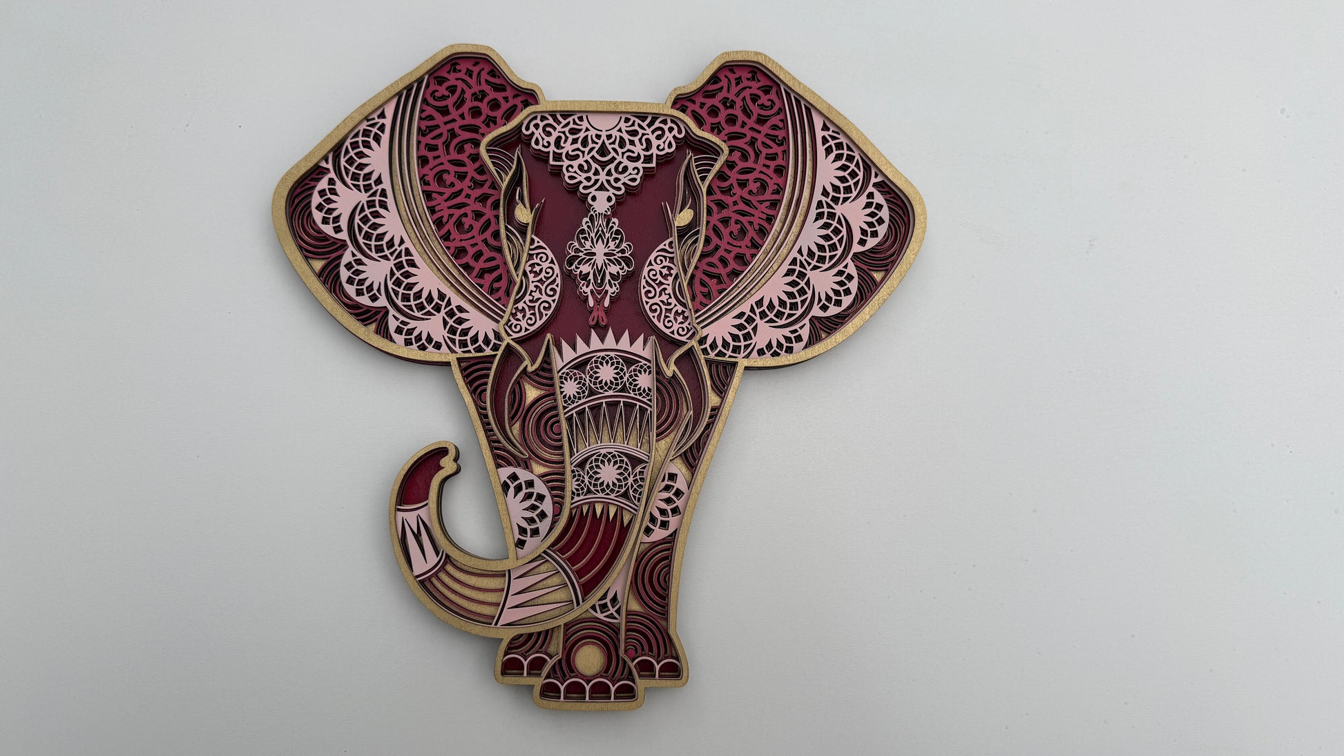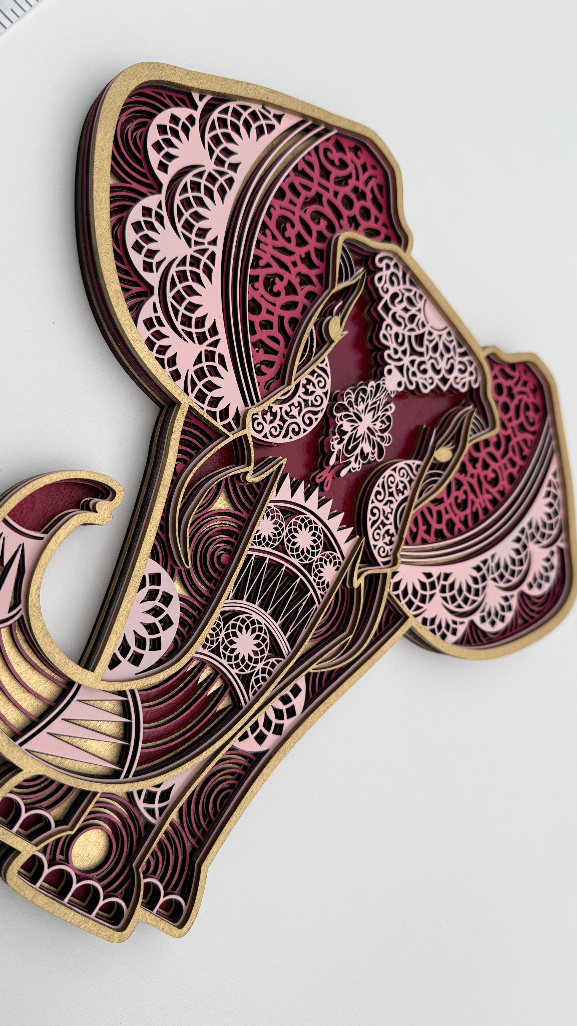Celebrate strength and serenity with this intricate elephant layered wood art. Each handcrafted layer reveals delicate mandala-style details in rich shades of pink, red, and gold. Symbolizing wisdom and good fortune, this piece adds elegance and cultural beauty to any space.